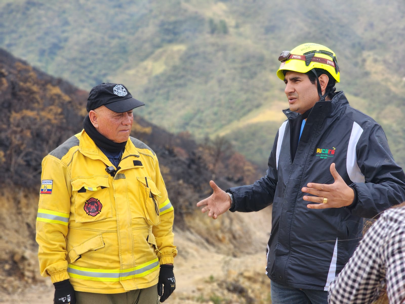 El alcalde Arq. Adrián Berrezueta y el Cuerpo de Bomberos Pucará valoran las hectáreas afectadas por los incendios forestales en el cantón.