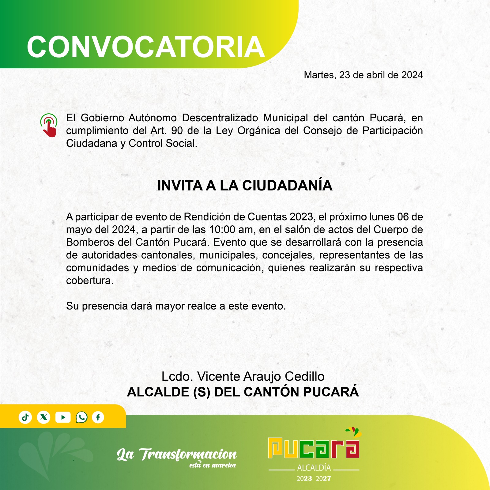El Gobierno Autónomo Descentralizado Municipal de Pucará, liderado por nuestra máxima autoridad, el alcalde Arq. Adrián Berrezueta Barreto, invita a los líderes comunitarios, de barri...