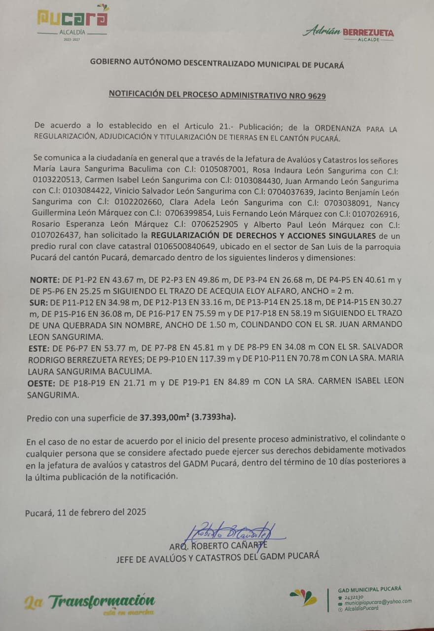 NOTIFICACIÓN DEL PROCESO ADMINITRATIVO NRO. 9629