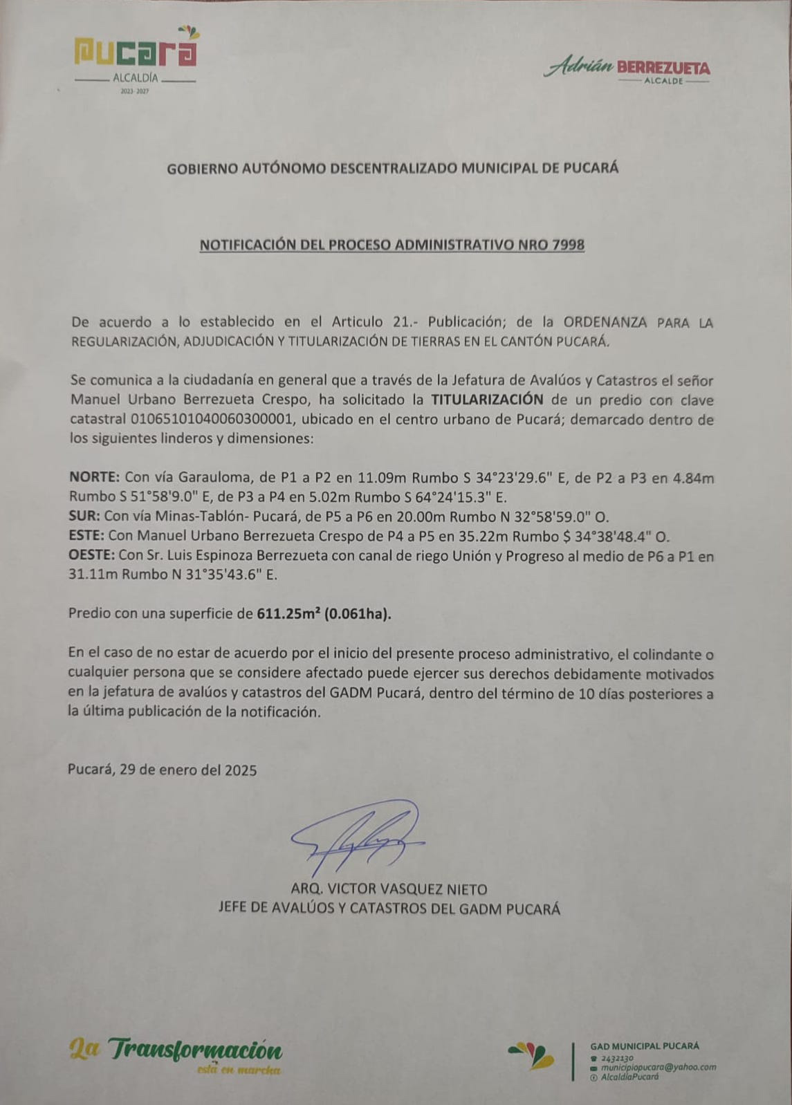 NOTIFICACIÓN DEL PROCESO ADMINITRATIVO NRO.7998